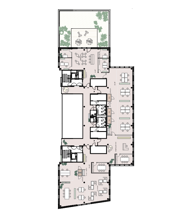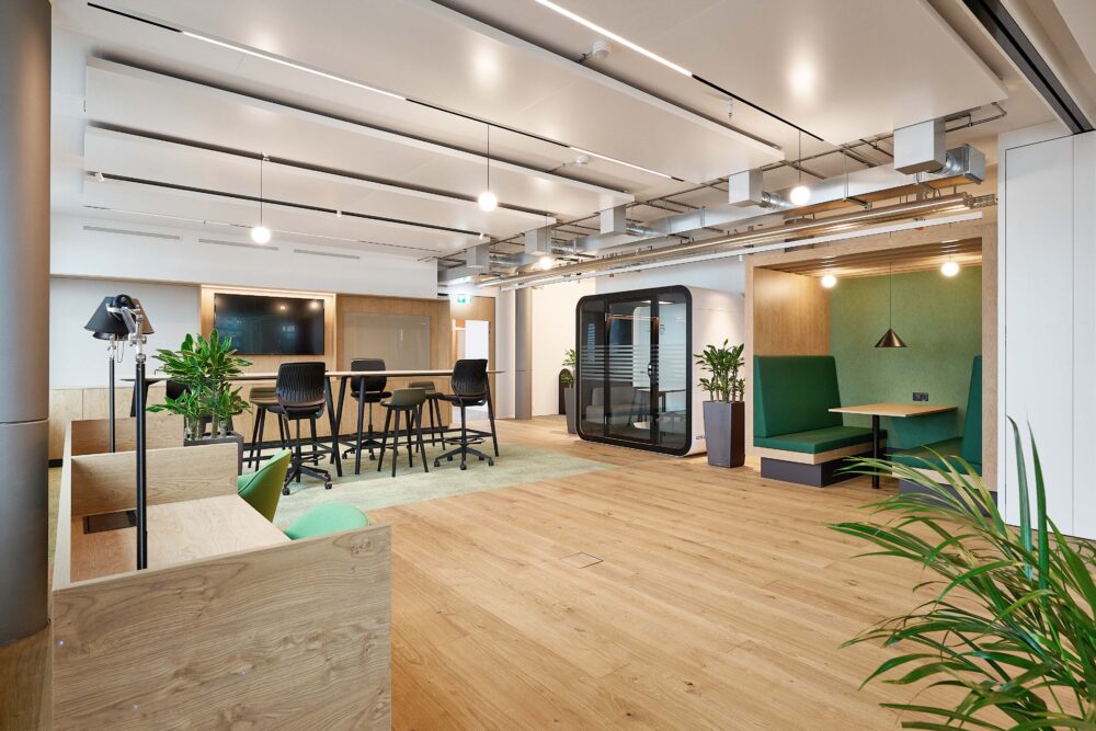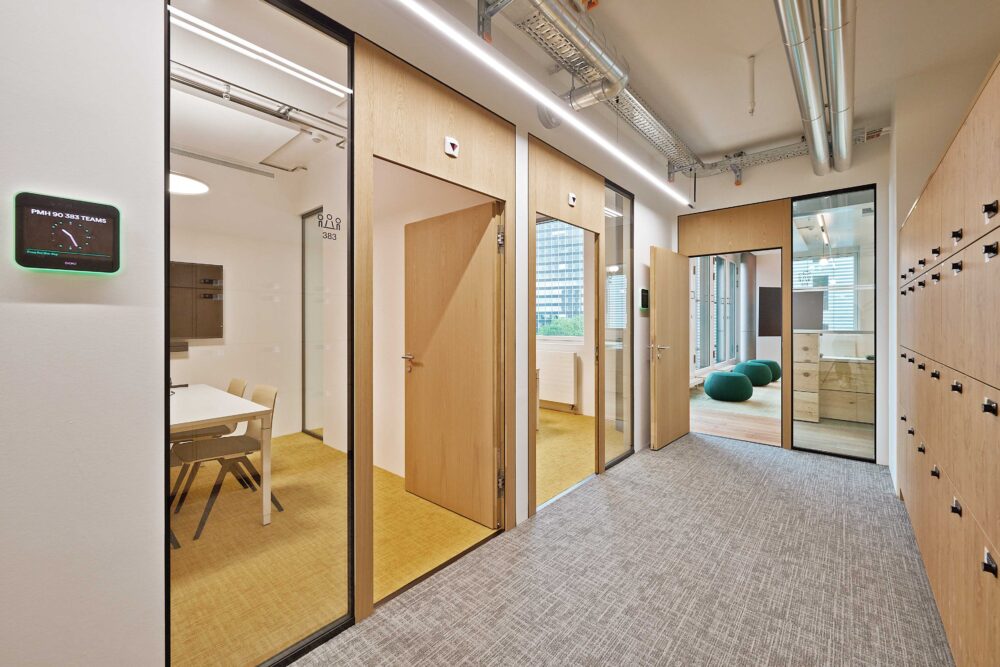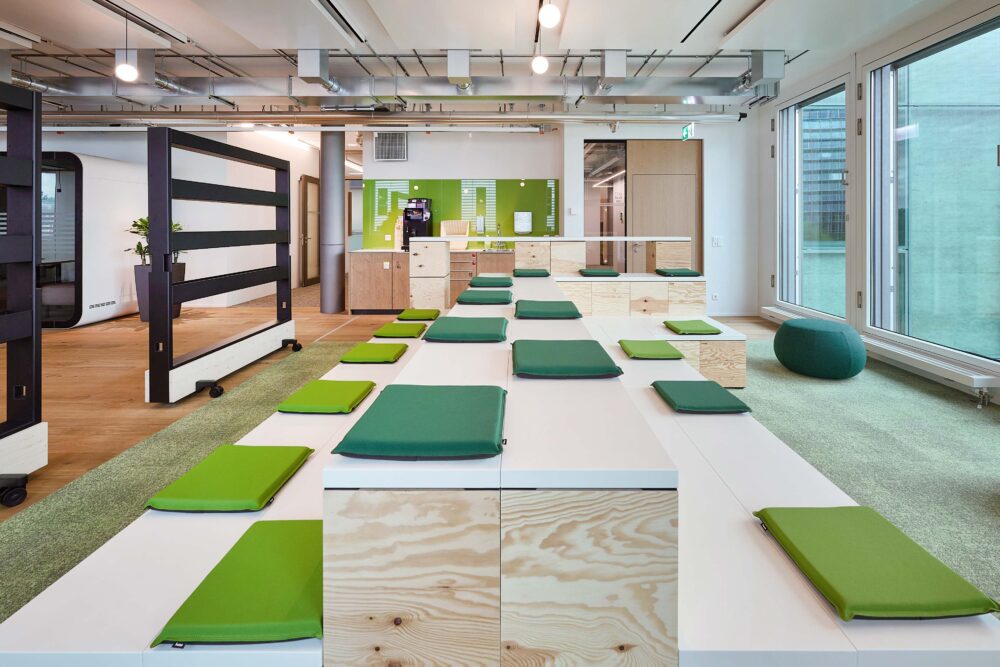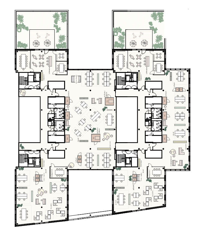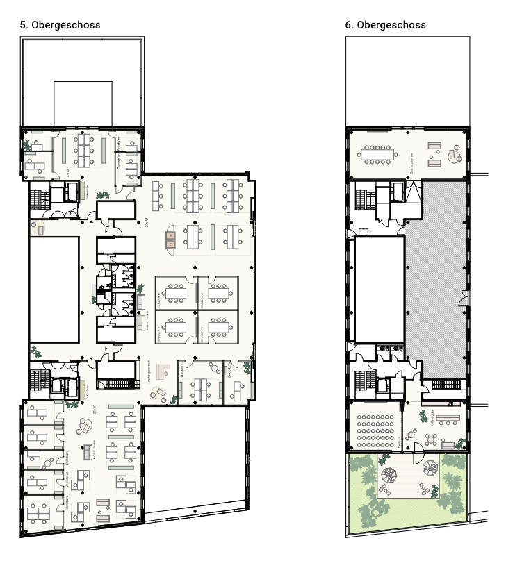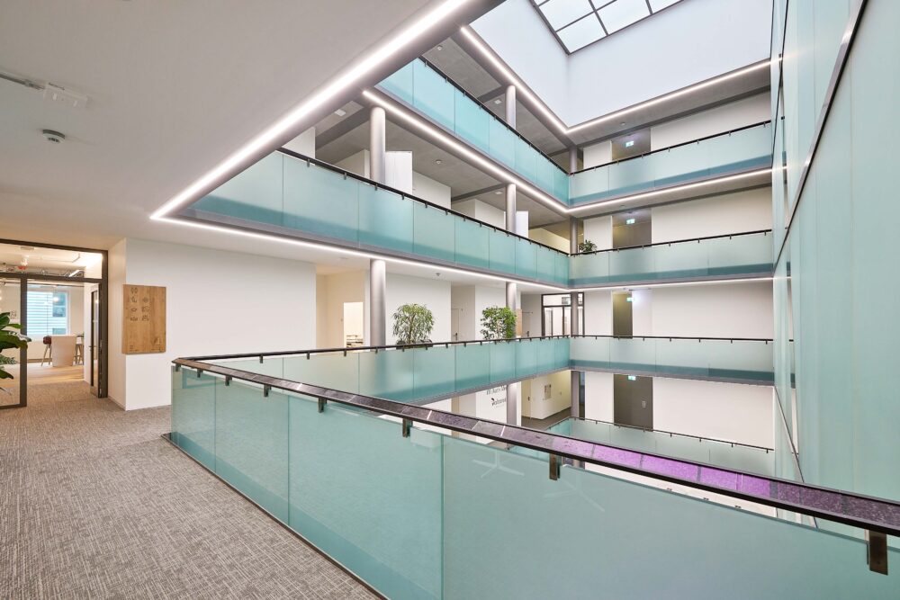 Die Bürofläche im 1. Obergeschoss ist vollständig ausgebaut mit Lüftung, teilweiser Kühlung, Duschen, Garderoben und zwei Küchen. Die anderen Einheiten werden im erweiterten Grundausbau angeboten. Dabei sind Lüftung und Kühlung über ein Deckensegel sichergestellt; der Doppelboden bietet flexible Gestaltungsmöglichkeiten für die unterschiedlichsten Layouts.