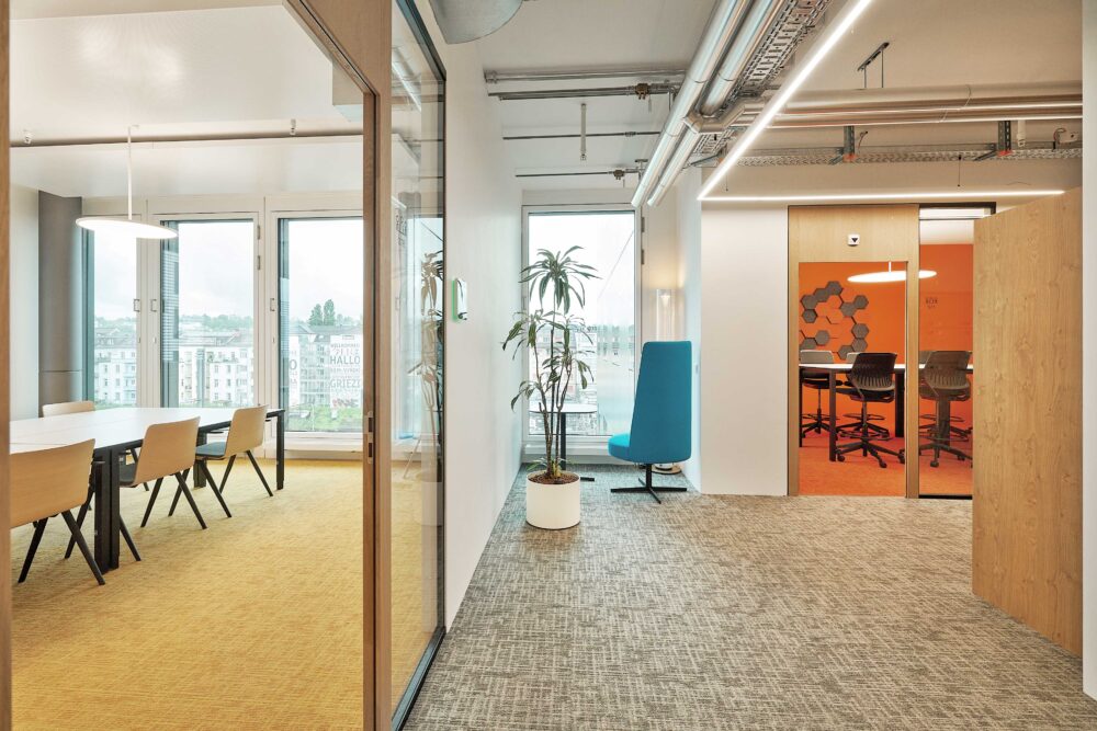 Zusätzlich zu der ausgezeichneten Anbindung an den privaten und öffentlichen Verkehr punktet das urbane Umfeld des Peter Merian-Haus Ost mit einer breiten Palette an Restaurants, Take-aways, Einkaufsläden und Hotels. Das nahe Rheinufer und zahlreiche Parkanlagen laden zu entspannten Lunchpausen, Spaziergängen oder sportlichen Aktivitäten ein.